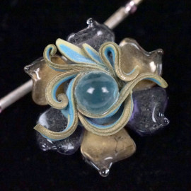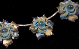 Parure collana e coppia di orecchini con charm a forma di fiori in paste vitree celesti, viola e dorate, lunghezza collana cm 44