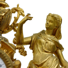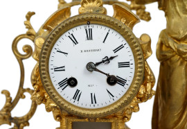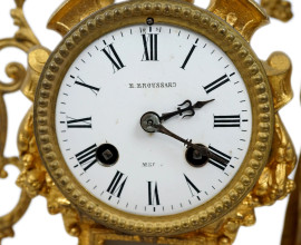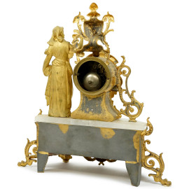 Pendola in antimonio e alabastro, E. Broussrd, quadrante circolare a numeri romani affiancato da figura femminile con nido, cm h 46x45x13,5, (difetti, meccanismo da revisionare).