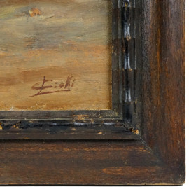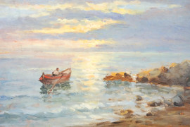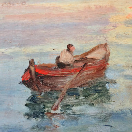 Pesca all'alba, olio su masonite, cm 30x40, firmato, entro cornice.