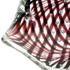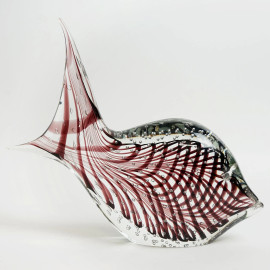Pesce, scultura in vetro di Murano con lavorazione a bolle e corpo con strisce amaranto, cm h 27x35, XX secolo.