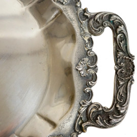Piccolo vassoio a guantiera in argento 800, manici e profili a motivi floreali, prima metà XX secolo, cm 38x25, peso gr.610, (difetti).