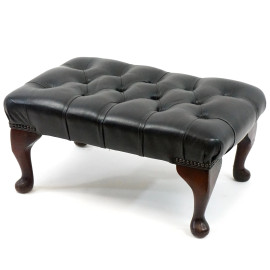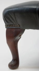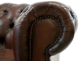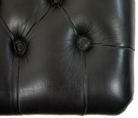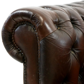 Poltrona e puff tipo Chester in pelle marrone, schienale e seduta a lavorazione capitonné, gambe mosse, misure poltrona cm 67x98x84, misure puff cm 29x65x41, (difetti).