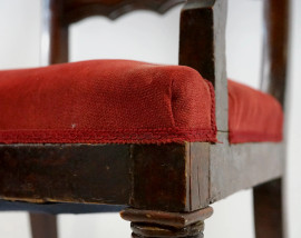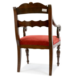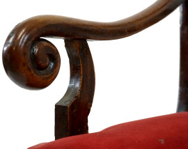 Poltrona in mogano, XIX secolo, schienale con cartella a giorno e cimasa intagliata, braccioli desinenti a ricciolo, seduta rivestita in tappezzeria rossa, due gambe tornite e due a sciabola, cm h 88, (difetti)