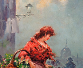 Popolana con cestino, olio su tela, cm 70x50, firmato F.Pecoraro, entro cornice.