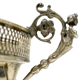 Portafiori in argento 800, prese laterali a foggia di mezzobusti femminili con riccioli, particolari cesellati, cm h 12,5x23, prima metà XX secolo, peso gr. 276