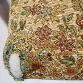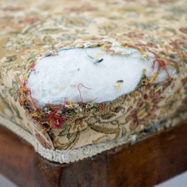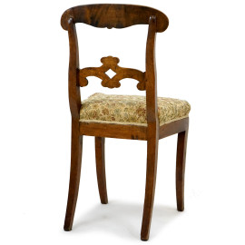 Quattro sedie in noce, XIX secolo, schienali a giorno di linea sagomata, seduta rivestita in tappezzeria color crema a decori floreali, quattro gambe a sciabola cm h 91, (difetti alle sedute).