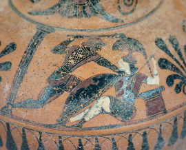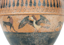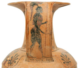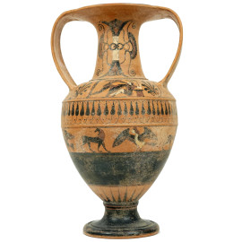 Corpo suddiviso in fasce sovrapposte raffiguranti, dall'alto, un'amazzonomachia tra le anse, opliti stanti ed in combattimento inframezzati da palmette, a seguire fregi di figure alate, motivi zoomorfi e fitomorfi.