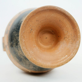 Riproduzione di anfora attica in terracotta con decorazione a figure nere, cm h 44, (difetti).