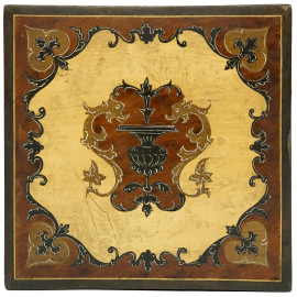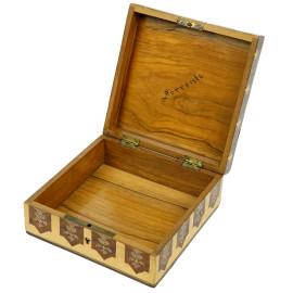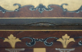 Scatola sorrentina riccamente intarsiato in varie essenze a motivo di vasi e volute, cm 6x15x14,5, XX secolo, (difetti).