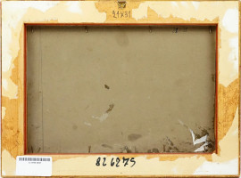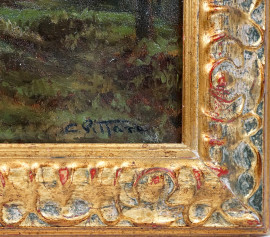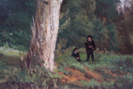 Scorcio boschivo con figure, olio su cartone, cm 21x30,5, firmato, entro cornice.