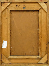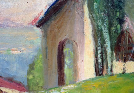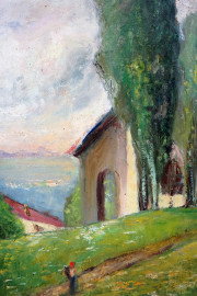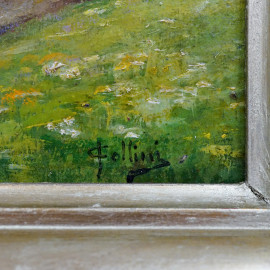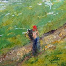 Scorcio campestre con figura, olio su cartone, cm 34x22, firmato, entro cornice.