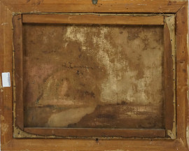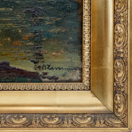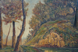 Scorcio montano con fiume, olio su tela, cm 50x99, firmato, entro cornice.