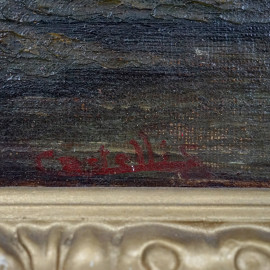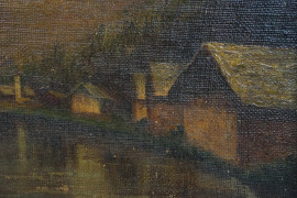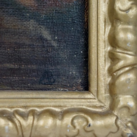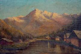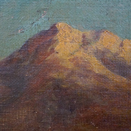 Scorcio montano, olio su tela riportata su tavola, cm 25x35, XX secolo, entro cornice.