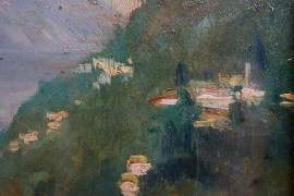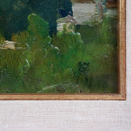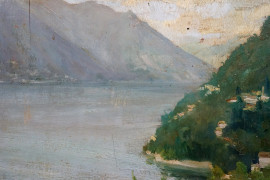 Scorcio sul lago, olio su tavola, cm 28x37 circa, firmato, entro cornice.