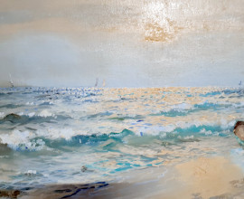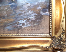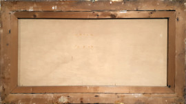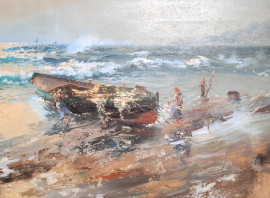 Scuola Napoletana del Novecento, grande dipinto raffigurante marina con barca e pescatori sulla riva, olio su tela, cn 60x120, firmato, entro cornice coeva