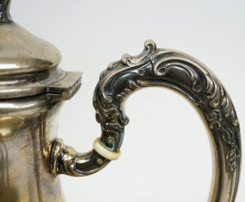Servizio da thé/caffé in argento, Argentiere SIAP, Alessandria, prima metà XX secolo, composto da (pz.5): vassoio di linea sagomata, teiera, caffettiera, lattiera e zuccheriera, misure max cm 57x38, peso gr. 3941