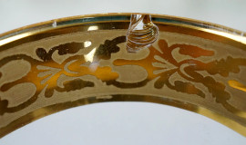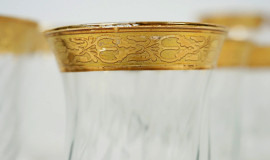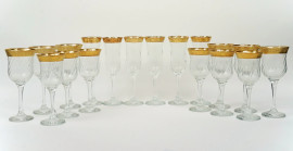Servizio di bicchieri in vetro trasparente con profili dorati, composto da sei calici da acqua, sei calici da vino e sei flute, XX secolo, (lievi difetti)