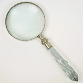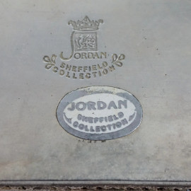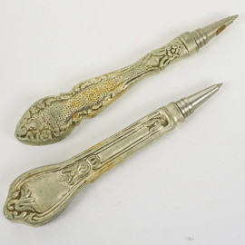 Set da scrivania composto da prisma, lente di ingrandimento, due penne biro ed un vassoietto in Sheffield, XX secolo, lunghezza max cm 24,5, (difetti)