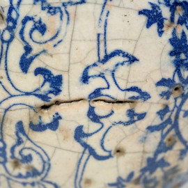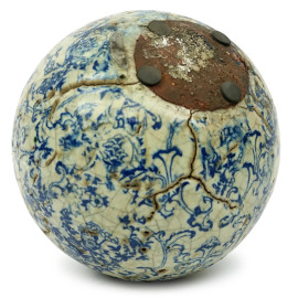 Sfera in ceramica craquelè bianca e blu con decori a ramages, cm h 18 circa