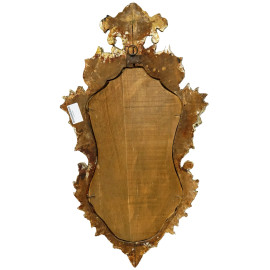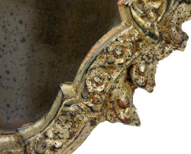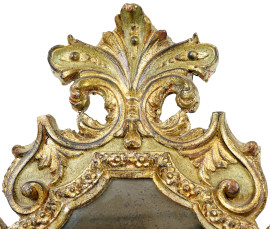 Specchiera di linea sagomata in legno intagliato laccato e dorato, decori scolpiti a fiori e volute, cm 78x45, XX secolo, (difetti).