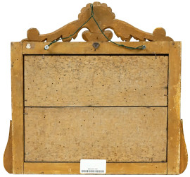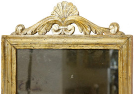 Specchiera in legno dorato con cimasa scolpita a palmetta e volute, XIX secolo, cm 38,5x41,5.