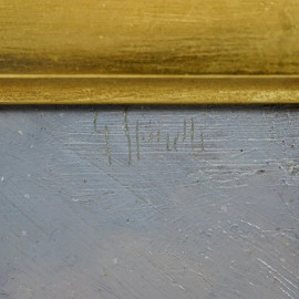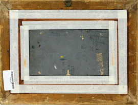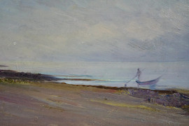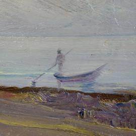 Marina con pescatore, olio su cartone, cm 16x26, entro cornice.