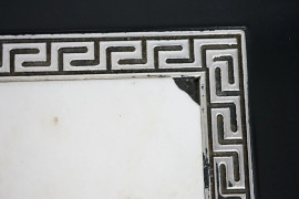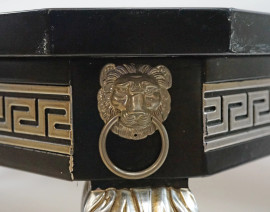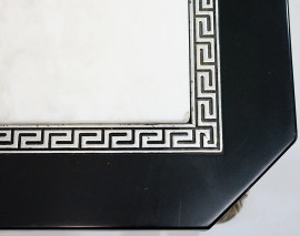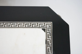 Studio Papiri, Basso tavolino in legno laccato nero, di linea rettangolare con piano incassato in marmo bianco, profili argentati a meandro, angoli scantonati decorati da teste leonine, quattro gambe mosse desinenti a ricciolo, cm h 49x160x90,5, 8, (difetti, sbeccature sul piano)