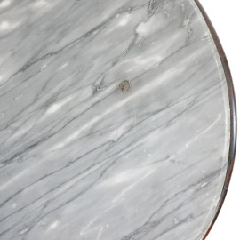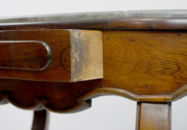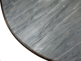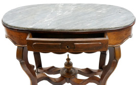 Tavolo di linea ovale con piano in marmo grigio incassato, un cassetto nella fascia, gambe mosse raccordate da crociera con pinnacolo, cm h 78, (difetti)