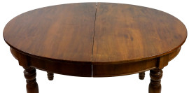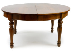 Tavolo in noce, XIX secolo, piano di linea ovale sostenuto da quattro montanti torniti, cm 79.5x114x150,5, (difetti).