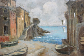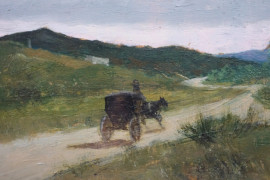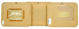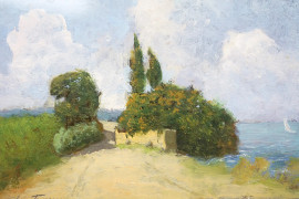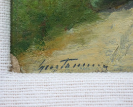 Tre piccoli dipinti ad olio su tavoletta raffiguranti paesaggi, cm 10x12, firmati, entro cornici, (difetti).