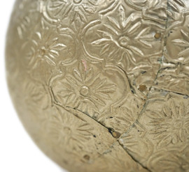 Tre sfere rivestite in lamina di metallo argentato con decori incisi e sbalzati, XX secolo, diam. cm 16 ca., (lievi difetti)