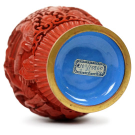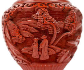 Vasetto cinese in lacca rossa intagliato con figure orientali entro paesaggi, cm h 17, Cina, XX secolo.
