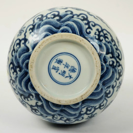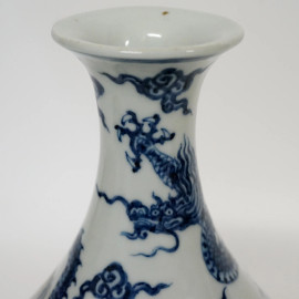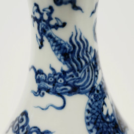 Vaso in porcellana bianco e blu a decoro di dragoni, cm h 28, Cina, XX secolo.