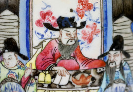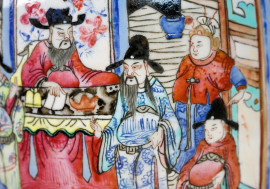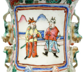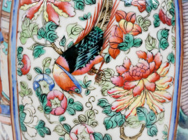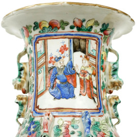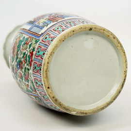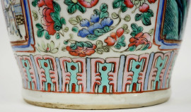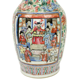 Vaso in porcellana policroma con decori raffiguranti personaggi di corte entro riserve rettangolari su sfondo floreale, cm h 45, Cina, XX secolo.