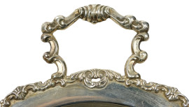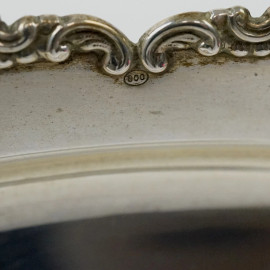 Vassoio a guantiera in argento 800, doppia presa laterale e profili cesellati a volute, seconda metà XX secolo, cm 52x32, peso gr.830