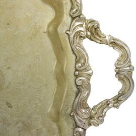 Vassoio di linea sagomata in Sheffield, F.B. Rogers Silver Co., manici e decori di gusto rocaille, poggiante su quattro piedini traforati, cm 4x62x36,5, (segni del tempo).