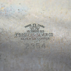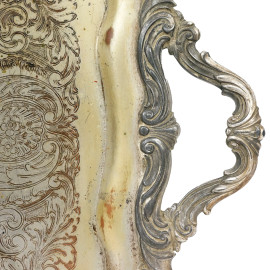 Vassoio in Sheffield, di linea sagomata con decori incisi e a rilievo, due prese laterali, marcato FB Rogers Silver Co., cm 5.5x74.5x47, (difetti).
