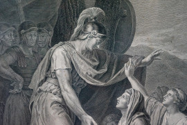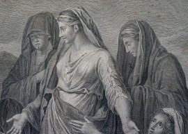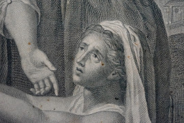 Veturia implora Coriolano, incisione, cm 58x73, pittore e inventore J.J.Le Barbier (1738-1826), incisore Avril (1744-1831), editori A.Bes et F.Dubreuil, XIX secolo, entro cornice, (macchie e difetti).