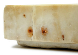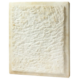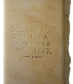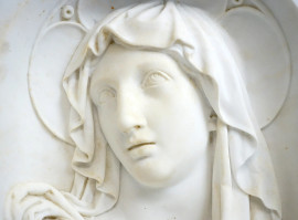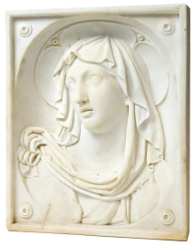 Vergine Maria, bassorilievo in marmo bianco, cm 36x29x8, firmato e datato 1857, entro teca in legno, (difetti).