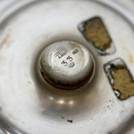 Zuccheriera in argento 800, coperchio con presa zoomorfa, doppia presa laterale e decori cesellati a mano e sbalzati a mano a foggia di foglie e fragoline, prima metà XX secolo, cm h 16, peso gr. 239
