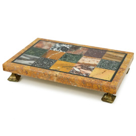 Alzata in commesso di marmi policromi a scacchiera, poggiante su piedini in metallo dorato, cm h 4,5x17x26.