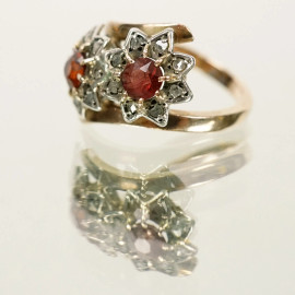 Anello in oro 18 kt con brillantini e rubini a due fiori, misura n. 9, peso gr. 4,5