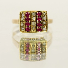 Anello in oro 18 KT con rubini e microperle incastonate, peso gr.3,3,misura 12,5