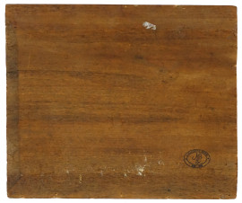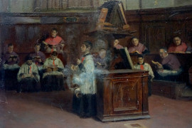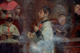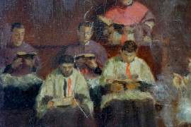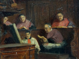 Anonimo macchiaiolo, Interno di chiesa con figure, olio su tavoletta, cm 24x28,5, entro cornice.