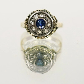 Antico anello in oro 18 KT con zaffiro centrale e schegge di diamante, peso gr.4,2, misura 12-13