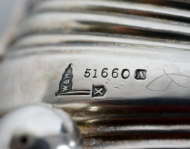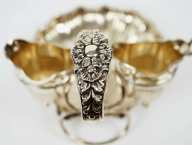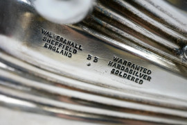 Antipastiera a forma di conchiglia in metallo argentato, Walker & Hall, Sheffield England, inizi XX secolo, completa di due salsiere, cm h 22.
