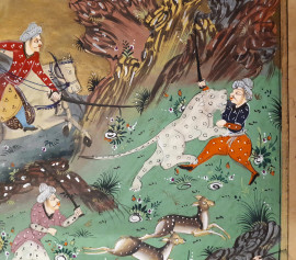 Arte islamica, antica e originale pagina miniata iraniana “Negargarè” raffigurante Scene di caccia, Persia, primi dell’800, colori vegetali e oro zecchino su carta, cm 27x18, reca iscrizioni vergate a pena d’oca e inchiostro nero in lingua araba