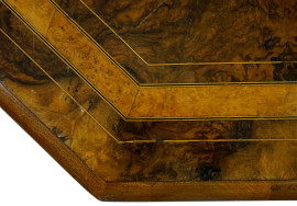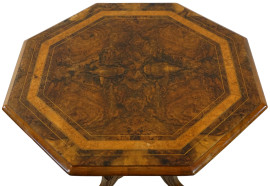 Basso tavolino con piano di linea ottagonale, fusto a balaustro con particolari intagliati, poggiante su tre gambe mosse desinenti a ricciolo, XX secolo, cm h 63x82x81, (difetti).