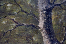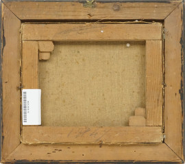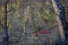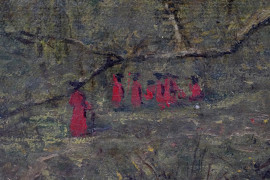 Bosco con frati in processione, olio su tela, cm 19x22, inizi XX secolo, entro cornice.