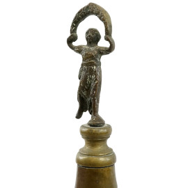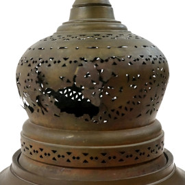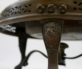 Braciere in ottone traforato, XIX secolo, sormontato da figura di fanciulla, poggiante su tre piedi con teste leonine, alt. cm 87, (difetti).